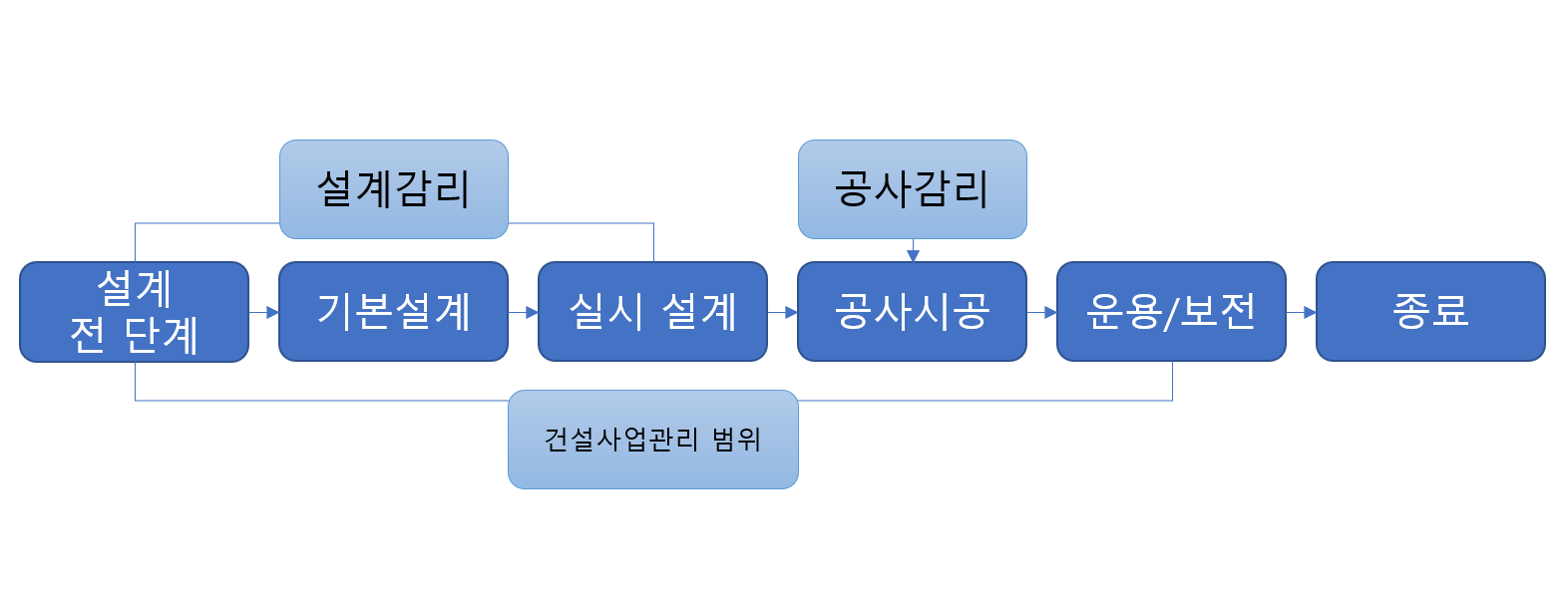 * 정의 : [건설사업기본법] 건설사업관리 란 건설공사에 관한 기획, 타당성조사, 분석, 설계, 조달, 계약, 시공관리, 감리, 평가 또는 사후관리를 수행하는 것을 말한다.